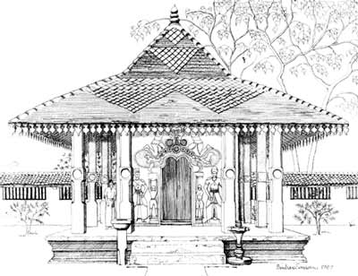 There are two platforms here. The lower platform is gained through two vahalkadas on the east and the south. A flight of steps on the eastern side provides access from the lower platform to the upper platform. Prakara walls around the platform are clad at top with tiles. Opposite the flight of steps leading to the upper terrace is the santi maduwa of the devala, which is a pillared structure provided with dwarfs on either side. Openings are provided on this dwarf wall for obtaining access to the image house on the north and to the Pattini Devala on the south. The dogge has wooden posts.